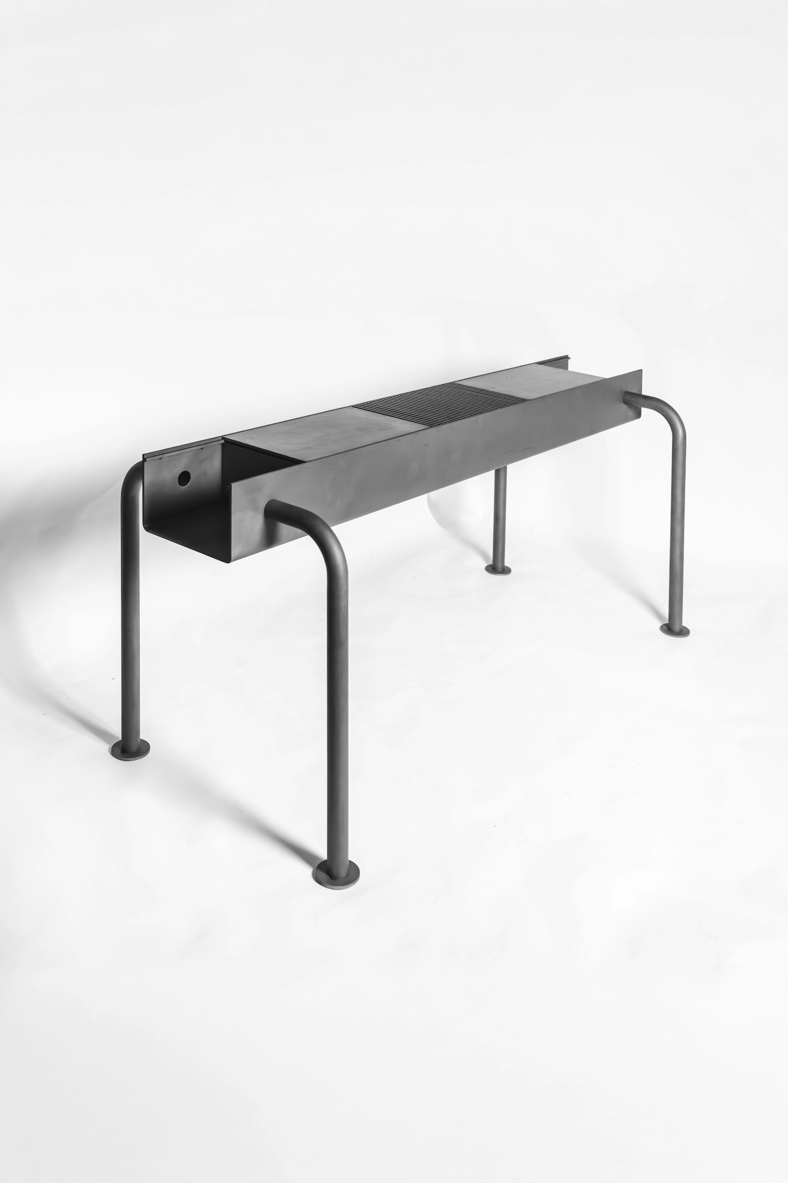 POOK ontstond uit noodzaak: met enkele vrienden waren we op zoek naar een barbecue of grill waar je ook gezellig rond kan staan in de winter. Ik besloot zelf een ontwerp te maken dat robuust is, maar ook mooi oogt in je tuin of op je terras. Het eerste model werd gemaakt uit de materialen van mijn tafelcollectie, puur voor eigen gebruik. Verschillende klanten waren enthousiast, dus werkte ik het ontwerp verder uit. Door uitgebreid onderzoek naar gebruiksgemak en temperatuurvereisten groeide het idee om het grill- en bakrooster in stukken op te delen en horizontaal te laten verschuiven in plaats van in de hoogte. Dat maakt het ook mogelijk om tegelijkertijd met meerdere temperatuurzones te werken.