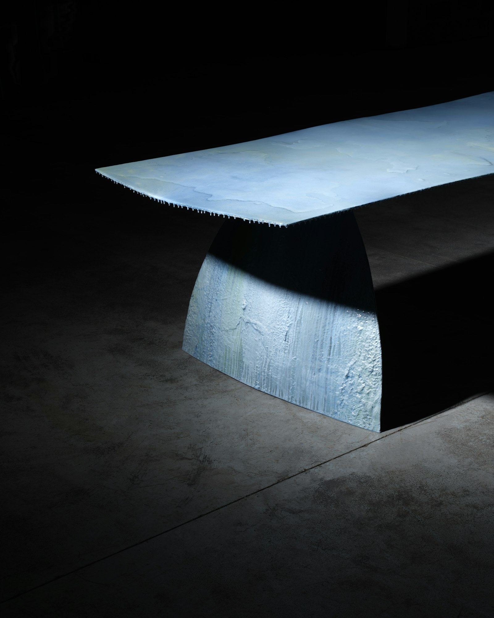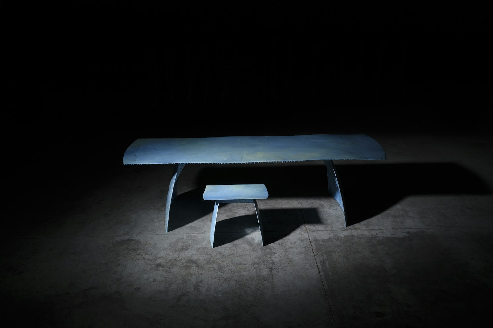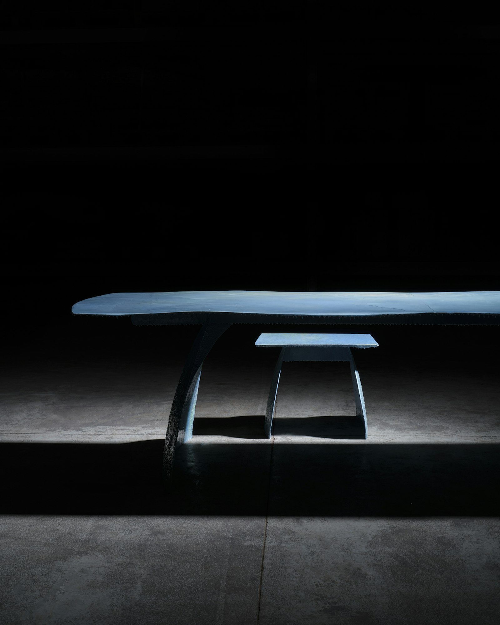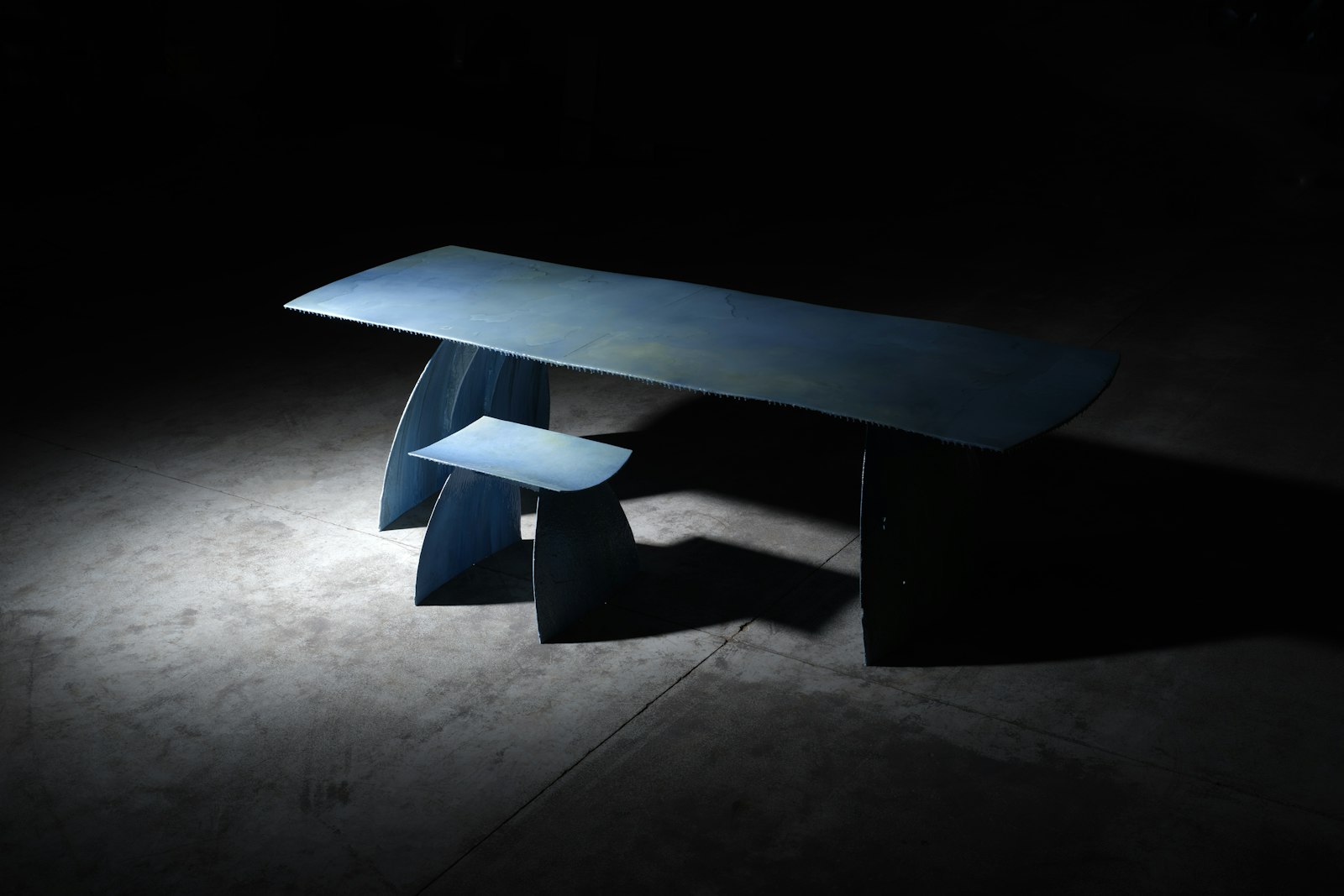 Zo ontstaat een meubelstuk dat niet alleen functioneel is, maar ook betekenis draagt. Elk stuk is handgemaakt en uniek: de structuren, kleuren en littekens van het materiaal blijven zichtbaar en maken elk werk onherhaalbaar. Het is design dat de sporen van tijd, vervuiling en transformatie zichtbaar maakt — een poëtisch object dat uitnodigt tot reflectie.