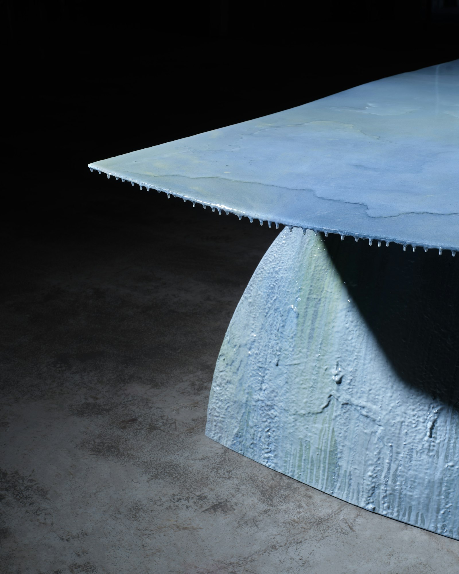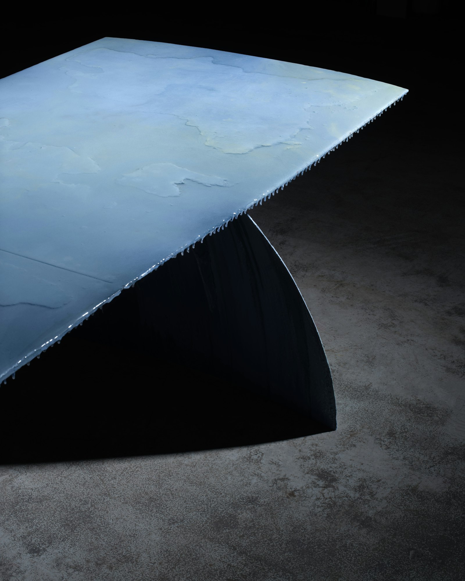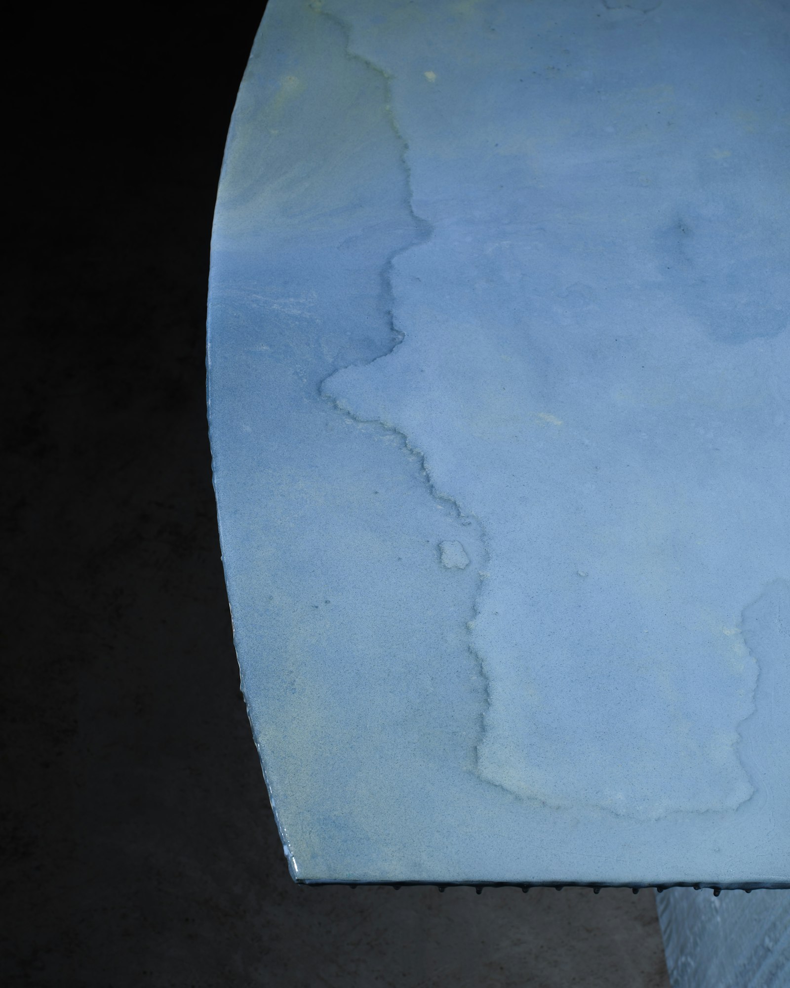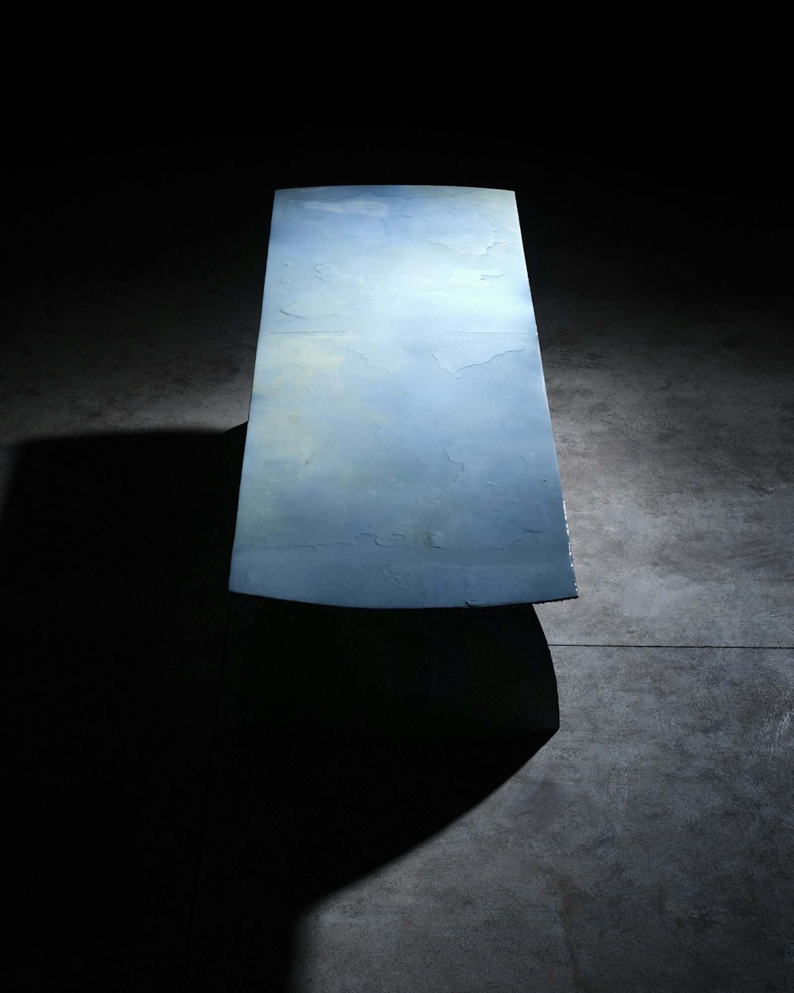 Het ontwerp is een tafel, vervaardigd uit een oude, opgegraven mazouttank die jarenlang onder de aarde verborgen lag. In plaats van dit object te beschouwen als afval, zien Middernacht & Alexander het als drager van een verhaal. Het metaal, de aangekoekte teerresten en de aarde die eraan vastzit, worden met zorg geconserveerd en niet gecamoufleerd. Door meerdere lagen epoxy brengen we dit rauwe materiaal tot rust, zonder het te zuiveren of te verdoezelen.