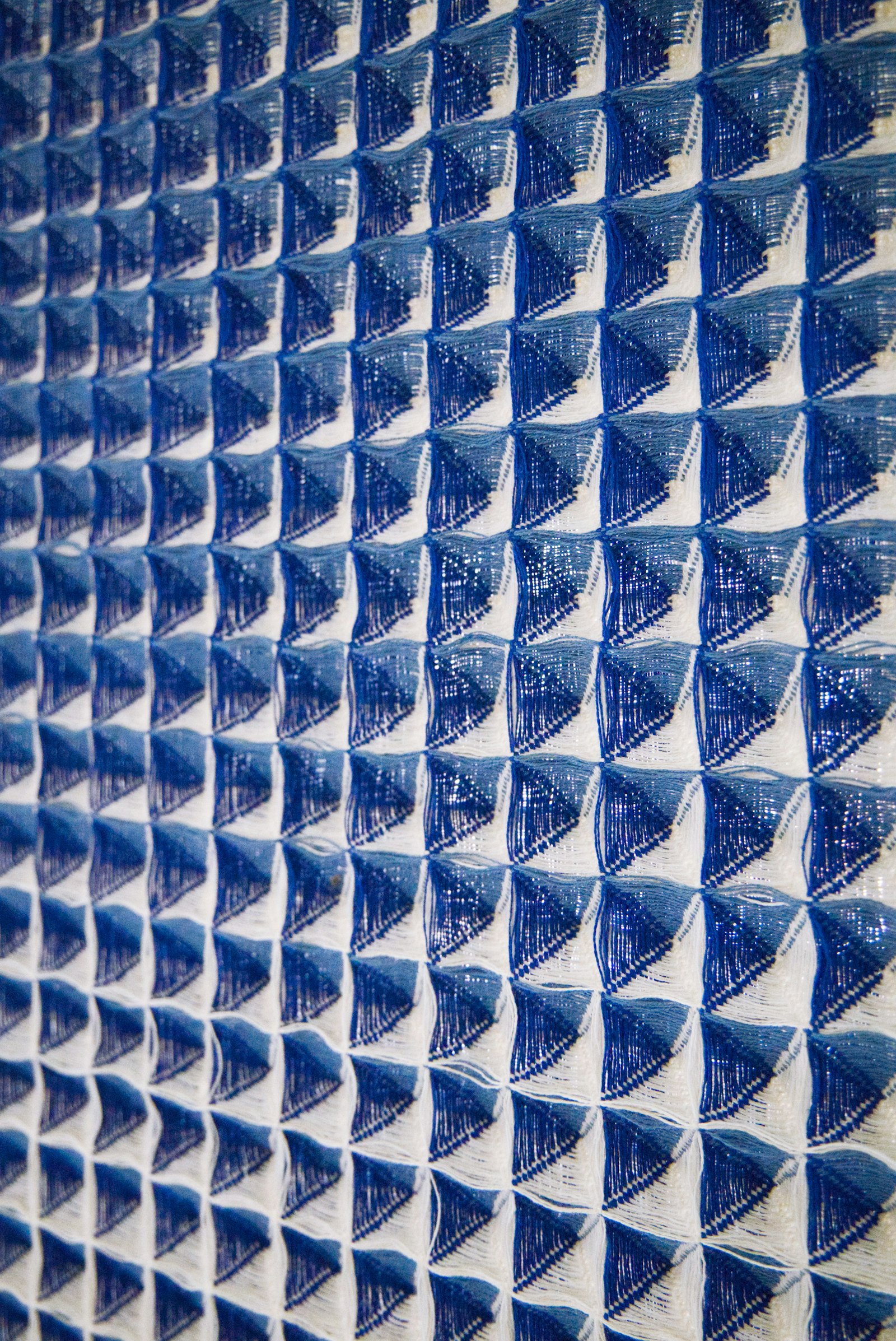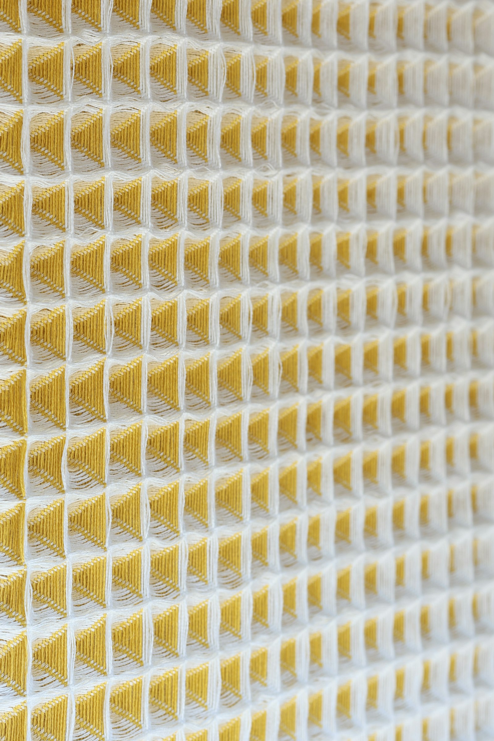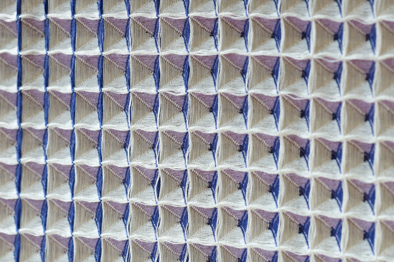 Een oude weeftechniek en ambachtelijke handeling wordt vertaald naar hedendaags textiel. Door het specifiek gebruik van kleur en de driedimensionele opbouw van het weefsel ontstaat een spannende ruimtelijke werking. Afhankelijk van het gezichtspunt komt de stof tot leven en door de structuur lijkt de stof te dansen in de ruimte. Een mooi voorbeeld van hoe relevant en eigentijds een ambacht kan zijn
