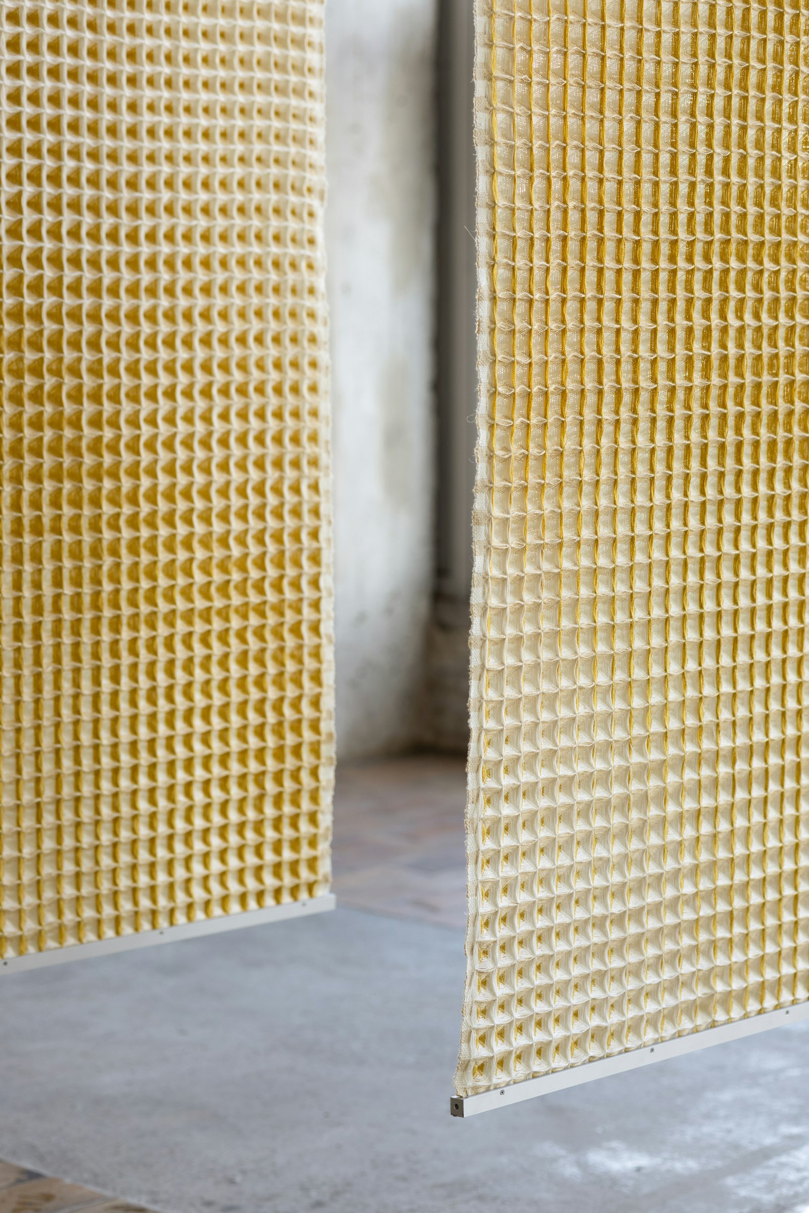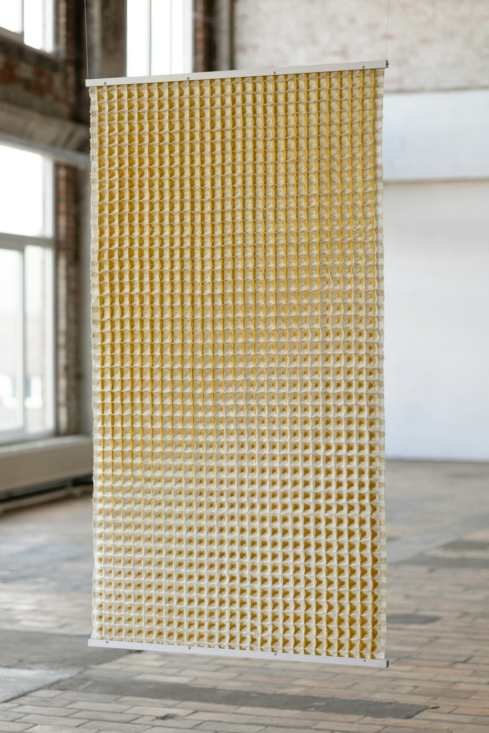 Shifting Colors is een serie geweven panelen in monumentale wafelbindingen, waarin subtiele verschuivingen van kleur ten opzichte van structuur vloeiende kleurovergangen creëren, gestuurd door digitale ontwerptools binnen een ambachtelijk maakproces.