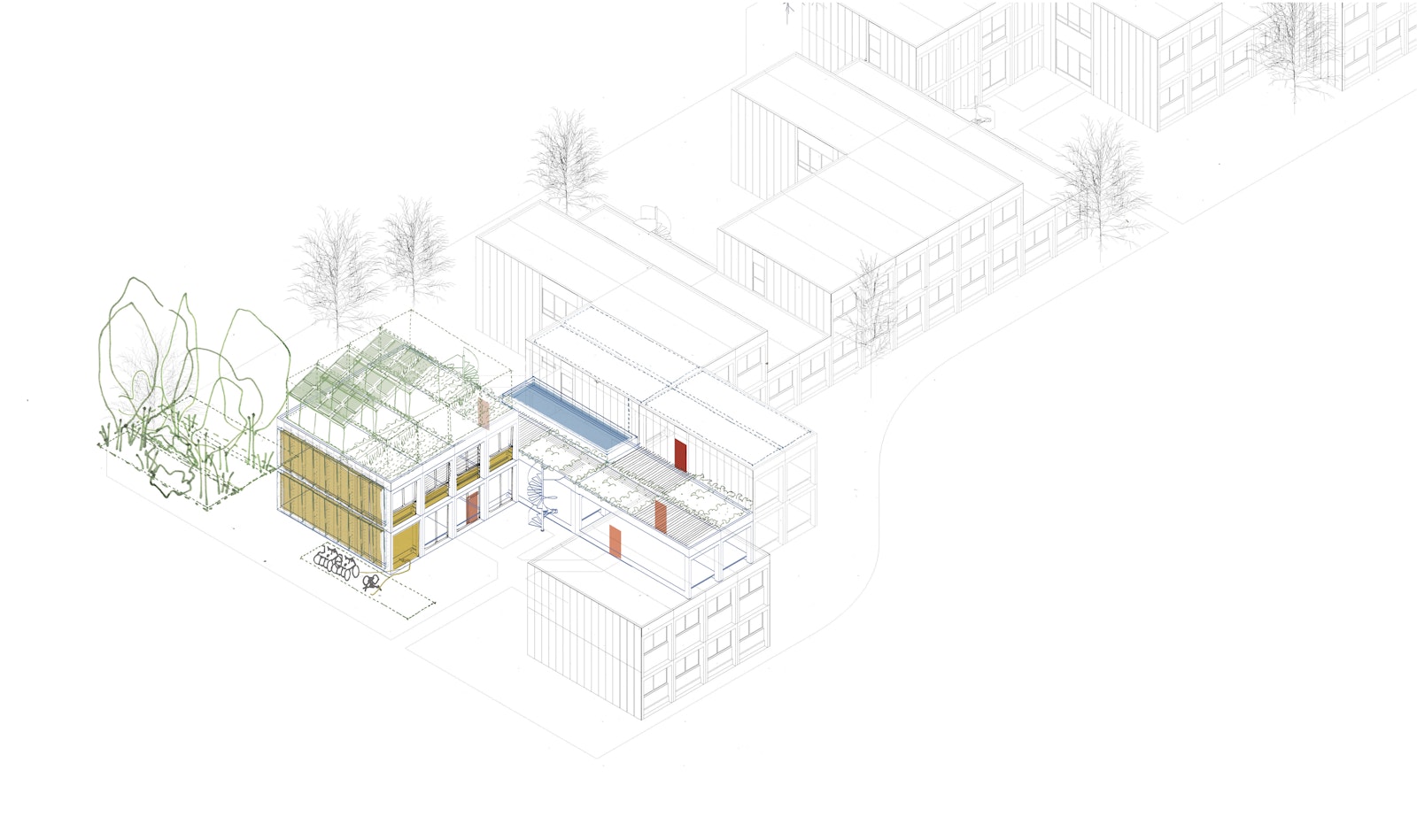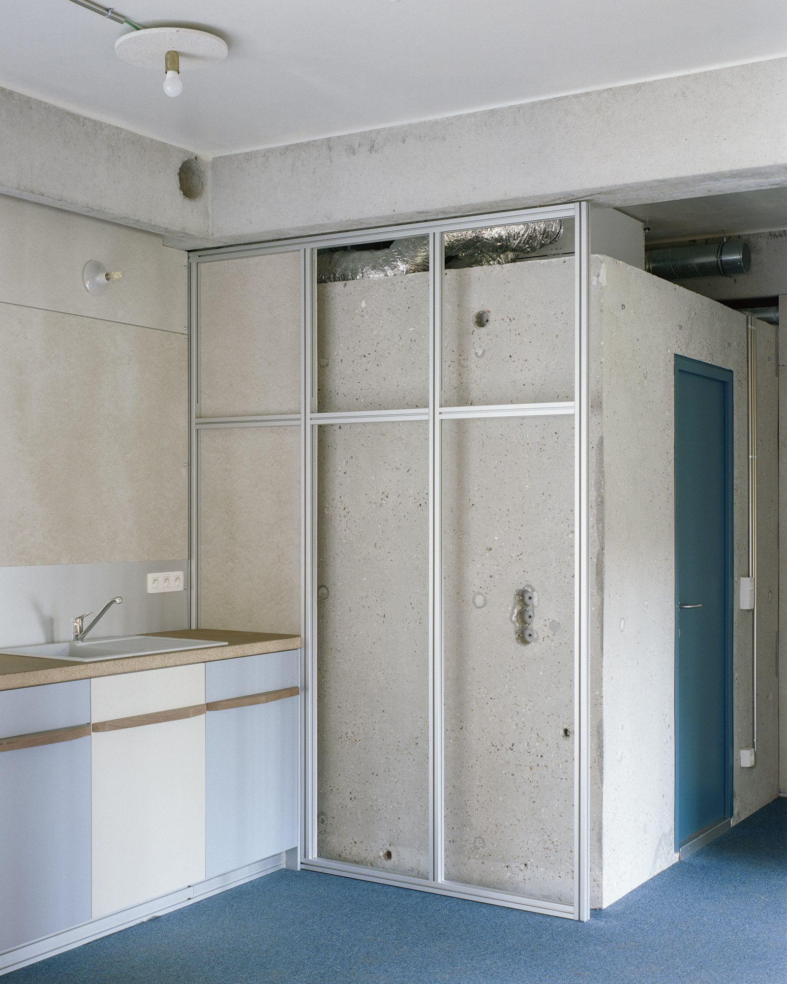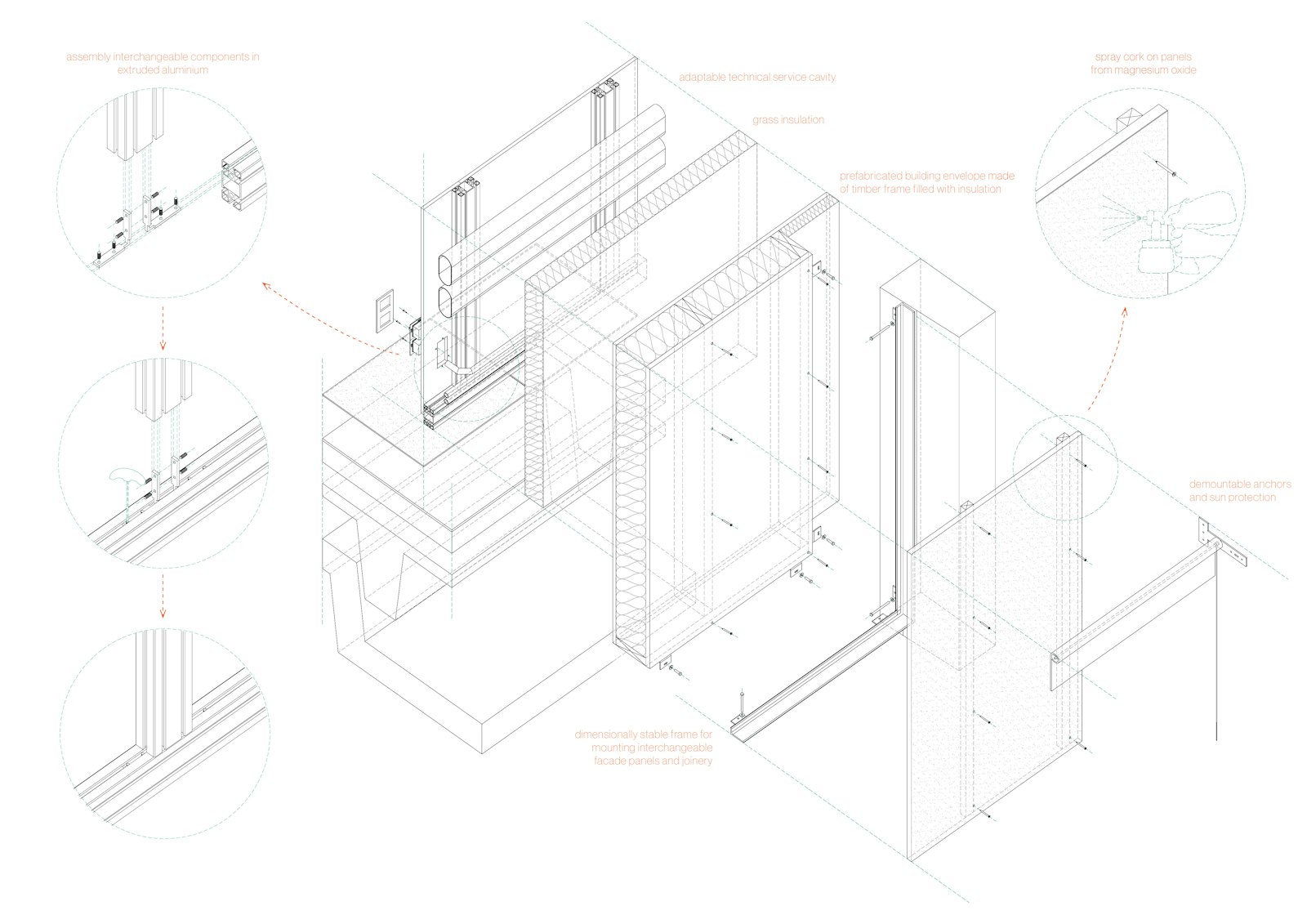 De bouwschil en de binnenwanden zijn ontworpen volgens het kit-of-parts-principe: polyvalente, compatibele en hanteerbare bouwcomponenten, gevormd volgens gestandaardiseerde maatprincipes en omkeerbaar geassembleerd, vergelijkbaar met een meccano-systeem.